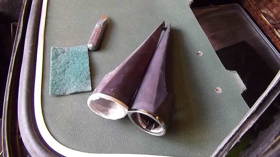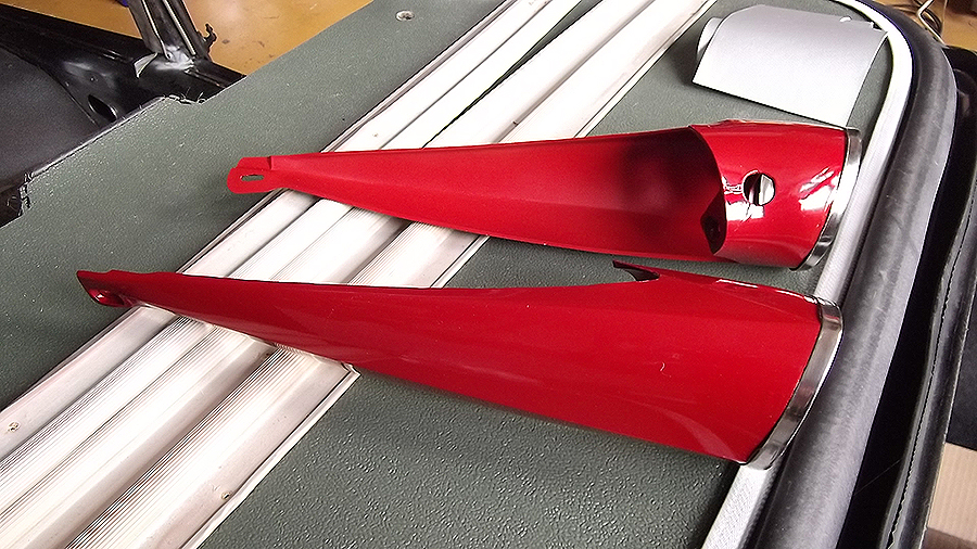 There is one detail of this car which identifies it as a French ID19 - the plastic "Cornets de Frites" - or rear indicator housings on the roof. On most DSs (and UK-market IDs) these are made from stainless steel. The plastic veriety were made from very fragile translucent red material which was prone to getting broken and tended to suffer from UV light over a number of years and turn dull opaque brown. One of the housings on this ID had cracked at the mounting hole underneath, and it is near impossible to glue successfully. However I had a go at this and then carefully rubbed them down and sprayed them with adhesion promoter, Peugeot Diabolo Red and clear laquer. I left the s/s end rings in place (these are often fitted to disguise a chipped rim). I was quite pleased with the result - although some people think they are a little garish. At Citromobile 2013 I managed to find a pair of these "Cornets" in very good condition (not new, but still translucent) - a rare find. I'll probably fit these over the winter. The other job I'm planning is to remove the wiper motor and investigate why it seems to be slowly flattening the battery (slight short). Unfortunately this means taking half the dashboard out to get at the mounting bolts . . .